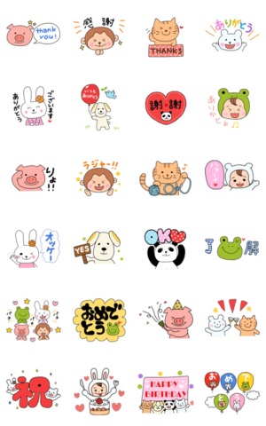 ブタ、サル、猫、クマ、うさぎ、犬、パンダ、カエルのありがとう&オッケー了解&おめでとうスタンプ。 たまに着ぐるみベビーも登場! 日常にも誕生日のお祝いにも使えます。momo より発売