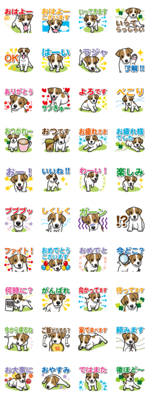 ジャックラッセルテリアのスタンプ第4弾です。元気でかわいいジャックラッセルテリアのイラストと、見やすいデカ文字で、いろんな場面でずっと使える内容にしています。
