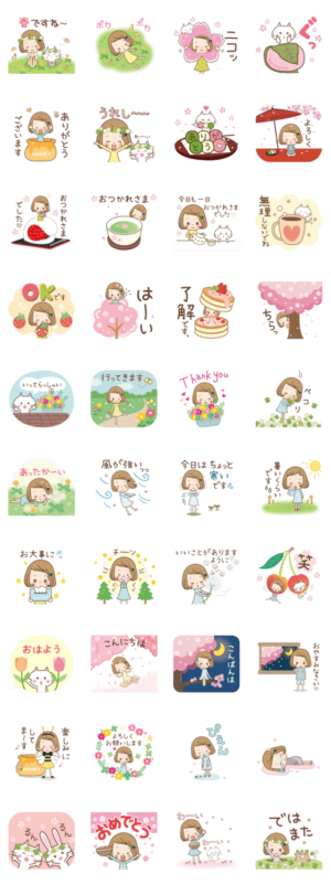 前髪短めな女の子の「春の日」スタンプ♪ 桜、タンポポ、3色だんごに桜餅、いちごやさくらんぼなど、春気分たっぷり♪な春の日に毎日使える日常スタンプです。かりん より発売