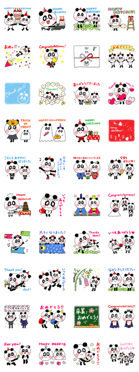 おめでとう、ありがとうを伝えるパンダくん。お誕生日、ハロウィン、クリスマス、お正月、ひなまつり、こどもの日、母の日、父の日などのハッピーイベントのおともに♪