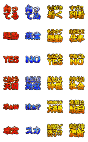 アニメーションもフォントもやたらと仰々しいスタンプの数々。一見ネタスタンプのように見えるが、実際のところけっこう使いやすい。ただし連発はしない方が吉。