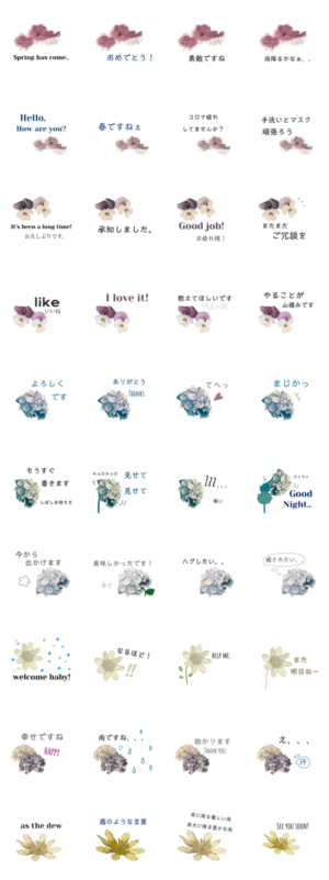 お花屋さんの雑貨を見ているみたいな気分になれるスタンプ作ってみました。日常/会話/挨拶/返事/セピア色/大人っぽい/笑いも共に