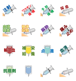 病院のワクチン接種の注射器や血液検査キット、点滴などのアニメです。医療や看護のステッカーです。医者や研究者から一般人にまで。