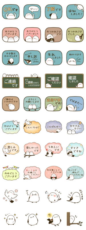 シマエナガの敬語のスタンプです。返事やあいさつ、気持ちなど伝えます。丁寧語が多いので、お友達だけではなく先輩や年上の方にも使えます♪