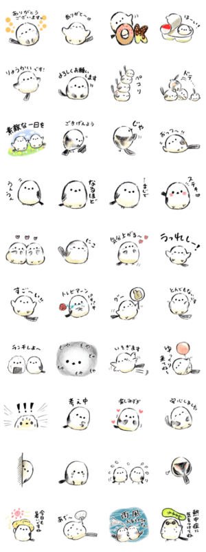 かわいい小鳥、北海道の雪の妖精シマエナガ 本州にもいるエナガの日常会話スタンプです。夏のおまけスタンプ付き。色鉛筆と水彩を使って描きました。