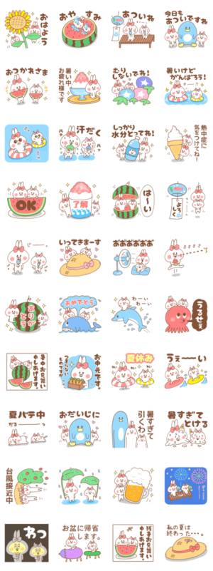 ウサコ&ネココ第3弾。夏関連【夏休み・海水浴・お祭り・お盆・スイカ・かき氷・ビール・熱中症・台風・梅雨・暑中お見舞い・残暑お見舞い・ホラー】など夏に使える40種!