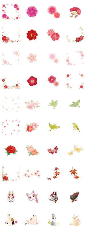 写真や動画に貼れる美しい和柄スタンプです。牡丹や桜、花びら、狐面、三毛猫・和兎など写真を華やかにしてくれるアイテム満載です。普通のスタンプとしても使えます。mayurimu より発売