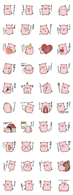 ちょっぴりレトロな絵柄の豚。使いやすい敬語スタンプです。こぶたのアトリエ より発売