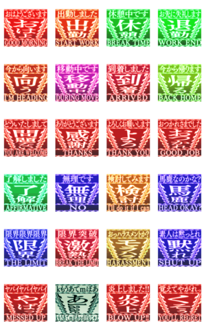 立体映像っぽいポップアップスタンプ 挨拶を中心にド派手に伝えるスタンプ 覚えてやがれっ 炎上 素人はだまっとれ 限界突破 ヤバイ 無理 今から帰る ハラスメント 激熱