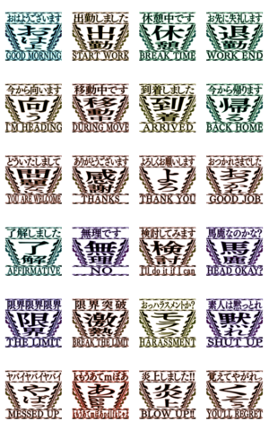 立体映像っぽいエフェクトスタンプ 挨拶を中心にド派手に伝えるスタンプ 覚えてやがれっ 炎上 素人はだまっとれ 限界突破 ヤバイ 無理 今から帰る ハラスメント 激熱グラプロ より発売