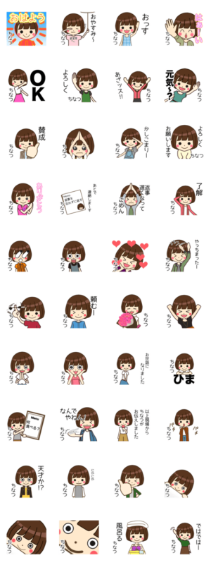 ちなつさんの名前入りスタンプ。 髪型が同じ「かーいって言いたいだけのスタンプ4」発売中