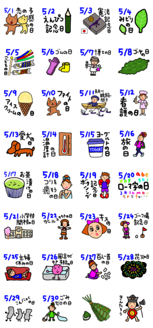 今日は何の日、5月編。みどりの日、子供の日、アイスクリームの日、ヨーグルト、長良川、鵜飼、ボクシング、お茶漬け、花火、キス、ゴルフyunyun より発売