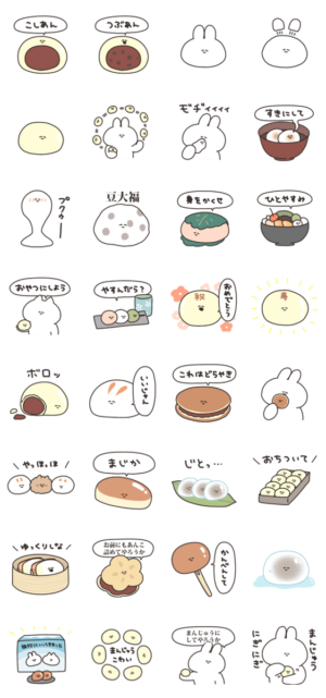 おまんじゅうや餅や和菓子になったうさぎのスタンプです。