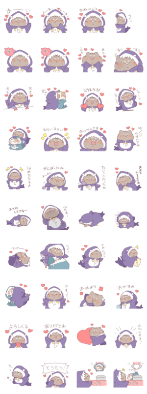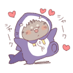 サメの着ぐるみを着たにゃんこスタンプです。かまってほしい時などにオススメです!駄菓子屋 より発売