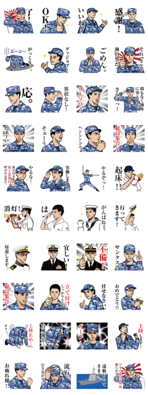 海上自衛隊のLINEスタンプ。海自の日常でよく使用される用語を特集しました。whiterain より発売