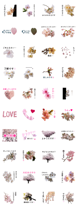 桜の花の実写スタンプ。ゆるい敬語・丁寧な言葉です。受験生、さくらさん、ピンク好きな方などに。にゃんころもち より発売