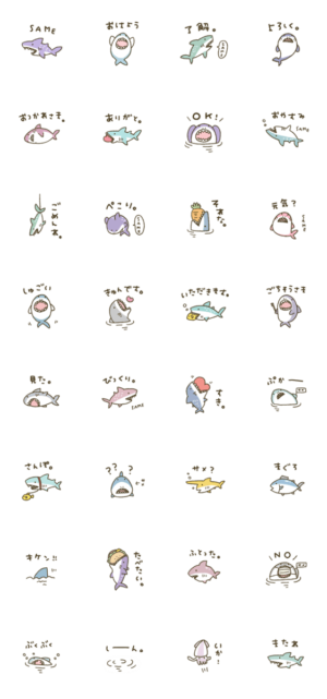 ゆるいサメさんのスタンプです。マグロでもイカでもない、サメだよ!かなぴ より発売