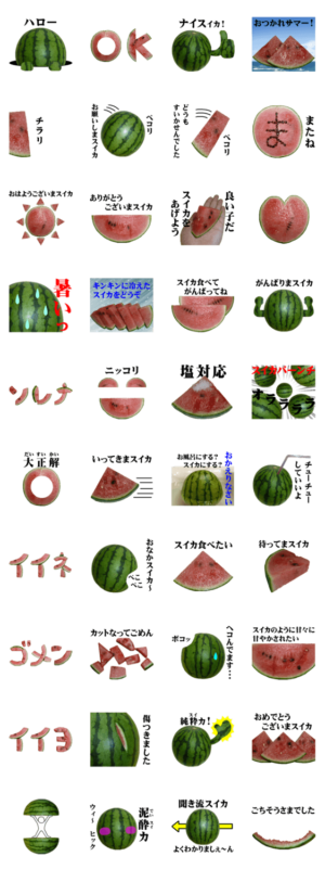 実写食べ物シリーズ第4弾は、夏にかかせない甘くて冷たいスイカです♪ 毎日使える言葉を厳選♪ すいかスタンプと一緒に、ひんやり涼しく楽しい夏をお過ごし下さい♪hiropi より発売
