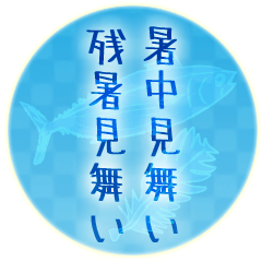 暑い夏に涼しい気分になりそうな青色の背景に夏をイメージするもの、魚などの絵があります。暑中見舞い・残暑見舞いの文章セットです。お世話になった人への夏のご挨拶に。うどんみかん より発売