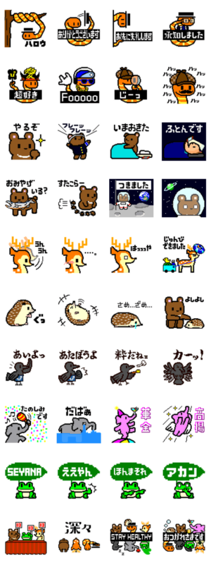 8ビット風ドット絵で抽象化されたどうぶつ達、第3弾です。くま、へび、しか等いつもの面々に江戸っ子カラス、華金好きなぞうが加わりました。毎日のお気持ち表明のお供に。Bear n' Deer より発売