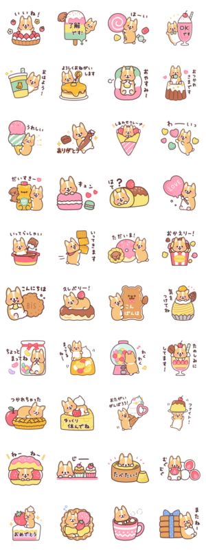 まるまるコーギーとスイーツがいっぱい!ケーキやプリン、パンケーキにアイスにクッキーも!パステルカラーのカラフルでかわいいスイーツとコーギーが楽しく会話を彩りますつじなつみ より発売