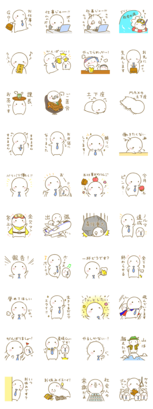 白くて丸いもち肌のいきもの。「しろまる。のゆるいスタンプ」第4弾は社会人編です。ゆるく生きよう。