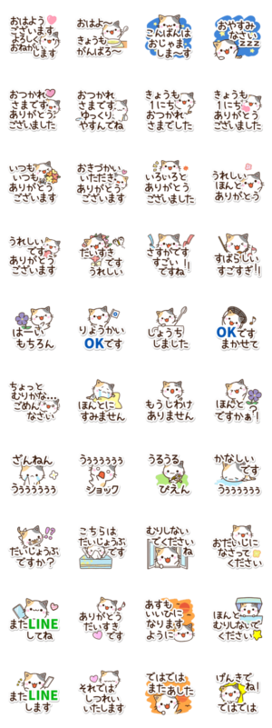 『ちびミケ』の『1回で気持ちが伝わる』三毛猫スタンプです。文字がいっぱい入っているので、一度で思いが伝わるネコスタンプ。ねこ好きな方にぜひ。【かたこ】