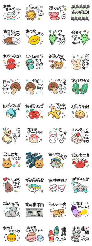 毎日楽しく使えるダジャレのスタンプ♪ スタンプに書いてある文字一覧