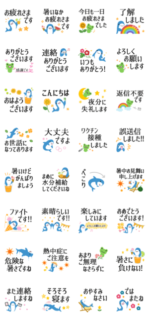 暑中お見舞い、熱中症に注意、水分とってなど真夏ならではの気遣い敬語スタンプ。連絡ありがとうございますや感謝と労りの気持ちが多めです。涼しげなサメが元気をお届け!