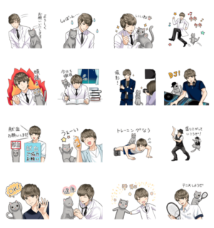 ねこのきもちの猫×イケメン『ねこと僕』スタンプ。モデルは美しい医男子コンテストGPの医学生・渡邉昂汰さんとロシアンブルーです。(スタンプデザイン:猫野ココ)