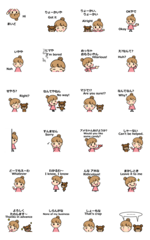 関西/大阪弁と英語のアニメーションバイリンガルスタンプ with ときどきクマ。英語、英会話を勉強している人、外国人の友達がいる人、どうぞ。プレゼントとしても。