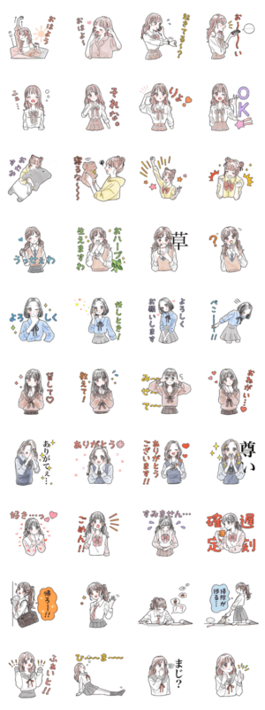 オシャレなふんわりかわいい女の子のスタンプです。日常会話で毎日使いやすい♪彼氏やお友達に。ふんわり女子高生、第6弾!セーラー服やブレザーの可愛いJKがたくさん!