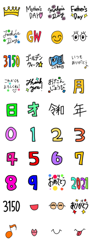 写真の上に貼って、デコレーションに使えるスタンプです。母の日、父の日、ゴールデンウィークの季節対応です。誕生日祝い、2021、令和、日、目隠し、マスクの上用デコも