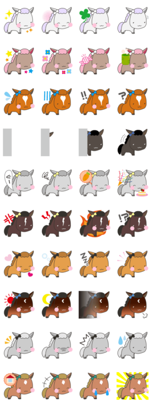 馬の表情がすごくかわいくて柔らかそうなほっぺたをつまみたくなっちゃいます。誰も嫌な気分にならない素敵なスタンプです。