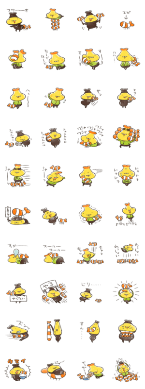 ゆるい天ぷらの忍者と侍の、エビと一緒のスタンプです。撫でたりかじられたり食べたりします。