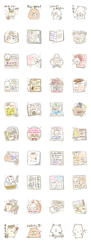 誕生日や招待状、お疲れ様など、本物みたいな?グリーティングカードのスタンプ。楽しく組み合わせて使ってください。シマリスや犬猫たちアニマルズのイラストです。