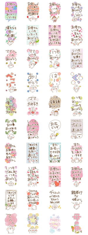 ねことうさぎの名前スタンプシリーズ。母の日(Mother\'s Day)のスタンプですよ♪お母さん、お義母さん、ママに日頃の感謝を♡山田まぽん作。