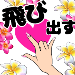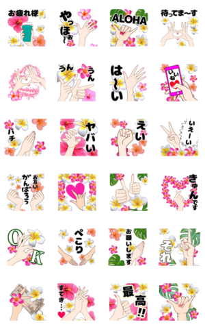 派手なハワイアンハイビスカス、プルメリア、モンステラと可愛い女性の指で気持ちとあいづちを表現出来ます。ボタニカルに癒され春夏秋冬毎日楽しく使えるポップアップです