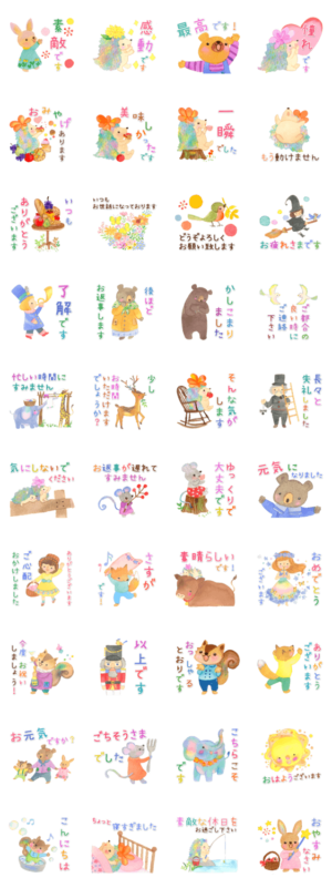 絵本作家Rokoが、水彩で描くかわいい仲間。友達から仕事仲間まで、楽しく使える「素敵な敬語」のスタンプです。