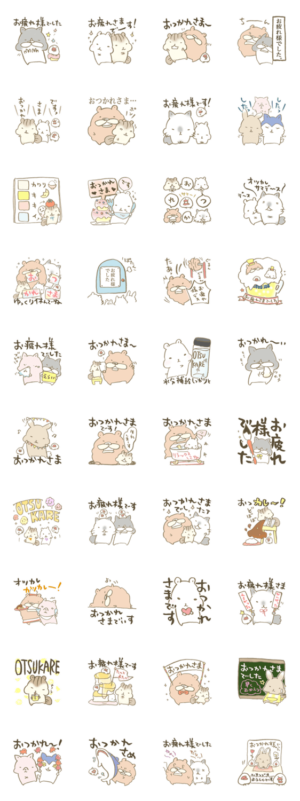 「お疲れ様でした」メッセージがてんこ盛り!ほとんどのスタンプに「おつかれ」の文字入り。お疲れな現代人にねぎらいを。シマリスや犬猫、鳥やうさぎたちがお送りします。