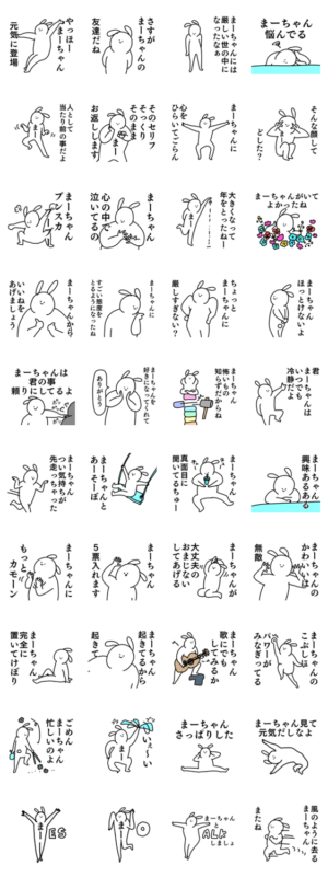 まがつく人が使えるスタンプ。マーチャン、まぁちゃん、まなみ、まさえ、まさこ、まさみ、まきこ、まさる、まこと、まあや、まあさ、まりえ、まりこ、まゆみ、松本、松村。
