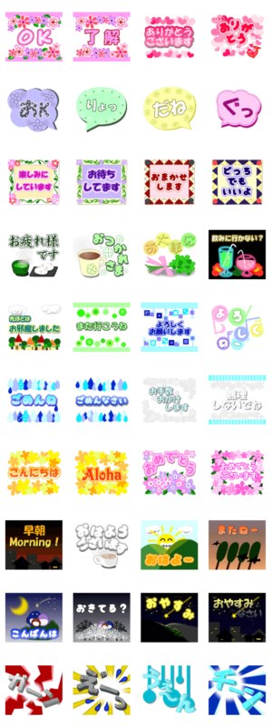 さっと送信できる一言メッセージや、気遣い言葉(おめでとう、お大事に、ありがとう、etc...)のスタンプです。