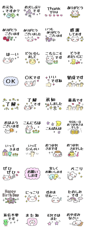 見やすい大きな文字とシンプルなイラスト、大人のあなたへ贈る使いやすい40個。かわいい白猫ちゃんの気持ちが伝わる敬語スタンプ。やさしい花いっぱいの癒し系です。