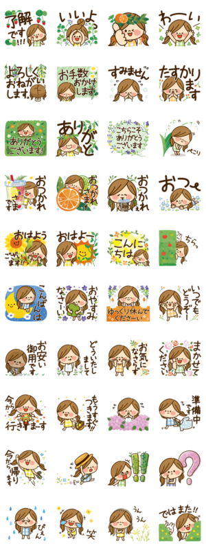 かわ主婦第55弾【ボタニカル編】はかわいい女の子のボタニカル柄のスタンプです!かわいらしい花や爽やかなグリーンが癒やしと元気をお届けします!敬語入りです。