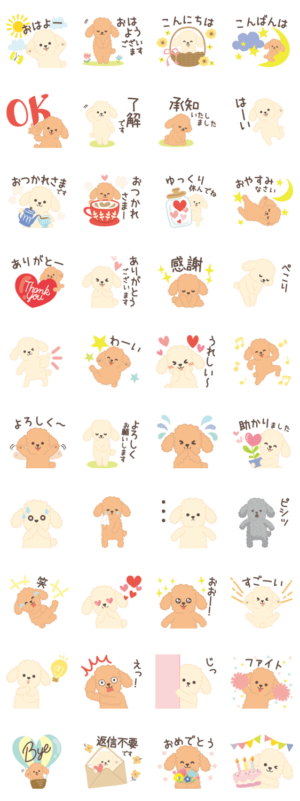 甘さ控えめ大人かわいいふわもこのトイプードルが仲間入♪毎日のあいさつに使えるシンプルな犬スタンプ。よく使う基本の言葉から敬語・挨拶もあるのでお仕事にも使えます。