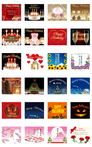 背景が動くエフェクトスタンプ。 誕生日/暑中見舞い/クリスマス/ハロウィーン/正月/母の日