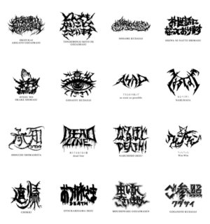 デスメタルロゴ風の日常系スタンプ。ビジネス編。同僚や上司、部下、取引先に使えるフレーズを揃えています。読みづらくても安心、ローマ字付き。