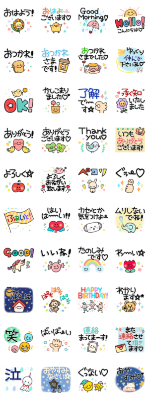 シンプルで可愛すぎないので大人も使いやすいスタンプ2です。毎日使えるように日常的な言葉は敬語を含め、いくつかのパターンを収録♪デカ文字の見やすい基本セットです!