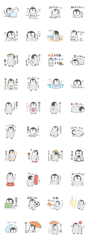 ペンギン・ひよこ達の、日常をはじめ、夏の終わりから秋にかけて使えるスタンプの詰め合わせです。おがわゆきこ より発売