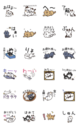 毎日使える少し動くネコちゃん3はでか文字のなかよしことば。三毛、トラ。ハチワレなどの楽しい仲間たち。シンプルなデザインで誰からの返信にも使いやすいです。